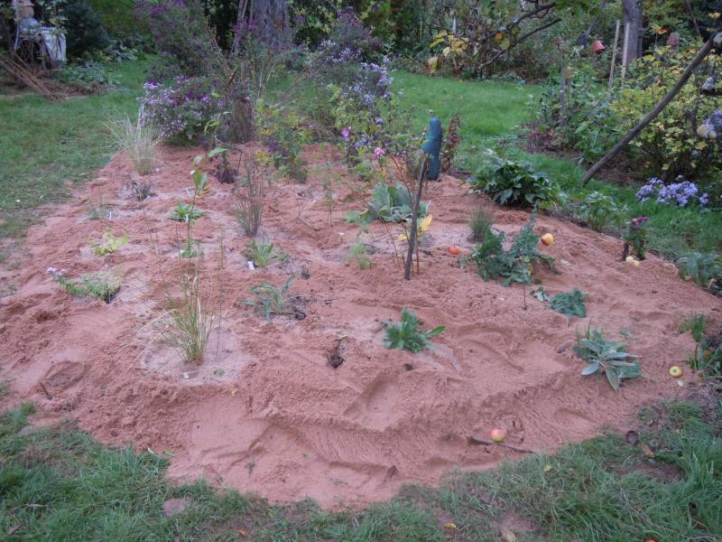 Ich habe den Sand allerdings nicht direkt auf die Grasnarbe gekippt, sonder vorher etwas umgegraben. Ein Teil des Beetes bestand bereits, dort habe ich den Sand als Mulch aufgetragen. Sanddicke irgendwo zwischen 8 und 15 cm.