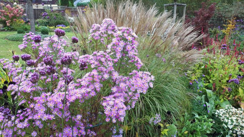 Aster 'Pink Star' mit Miscanthus 'Adagio' und Verbena bonsariensis.