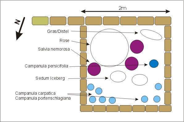 Hallo TKsys, sorry für die späte Antwort ...ist halt (Um)Pflanzzeit ;DWenn Du eine Strauchrose genommen hast, solltest Du schon so ringsrum 40-50cm Platz lassen, bei einer Hochstammrose kannst Du dichter ranpflanzen. Wenn Du keine Erde sehen willst, kannst Du schon bissel dichter pflanzen. Für den Salvia nemorosa kannst Du einen Platzbedarf von 30cm im Durchmesser rechnen. Bei den Campanulas - wie gesagt - habe ich keine Erfahrung.