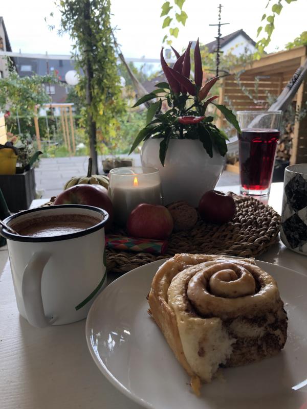 Ich habe heute Mittag Zimtschnecken gebacken, die gabs mit leckerem Zimtkaffee (sagte ich schon, dass ich Zimt liebe? :D) heute auf der Terrasse :D