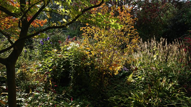 Das Japan-Waldgras ist noch nicht verfärbt, beteiligt sich aber an der Hersbststimmung.