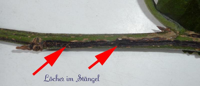 Mit dem ersten Ast bin ich zu dem Gärtner wo ich die Pflanze gekauft habe, die haben den Gang geöffnet und geschaut ob etwas drin ist - Leider haben wir dort nichts gefunden. Von daher kommt auch die Vermutung mit der Miniermotte.