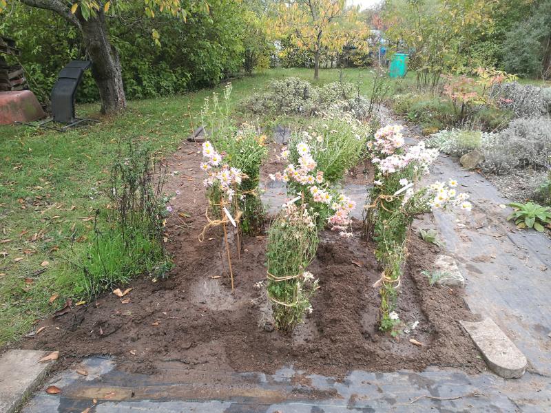 Der Reihe nach: Morgens mit Lilo die Beute aus dem Wühlmausgarten geteilt. Mittags kam Anke mit ihren Chrysanthemen-Sämlingen. Oh wasn Glück dass ich soviel Platz gemacht hatte. 11 Sämlinge haben wir gesetzt, viel Lehm und etwas Kompost eingearbeitet, Gießrand geformt, Stecken gesetzt und aufgebunden, Schilder geschrieben und angeheftet. Dann konnte ich noch die eine oder andere Wühlmausbeute schon unterbringen. Wetter ging so, irgendwann waren wir dann fix und alle und kaltgefroren.