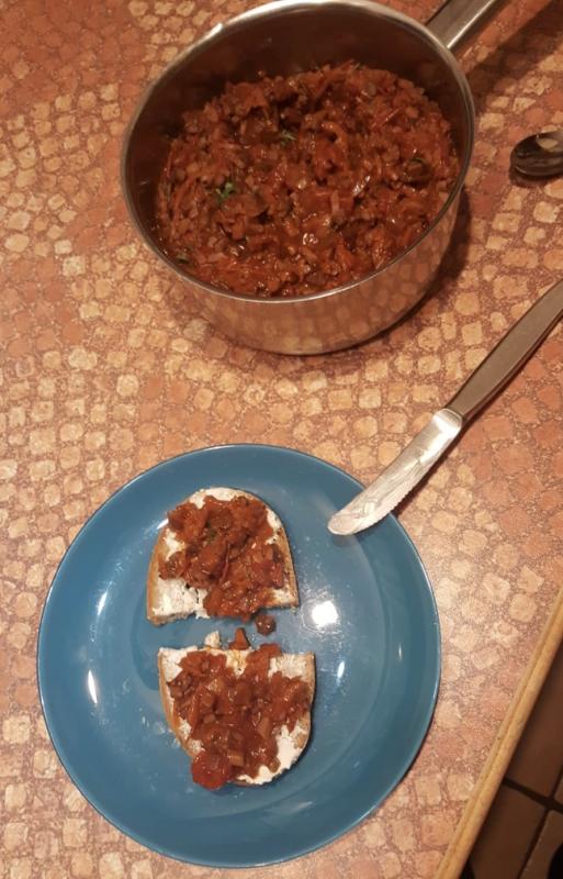 Unser Nachbar hat mir gestern Abend noch ein Foto geschickt. Er hat das Pilzragout als Pesto auf Brot gegessen und war begeistert. ;D
