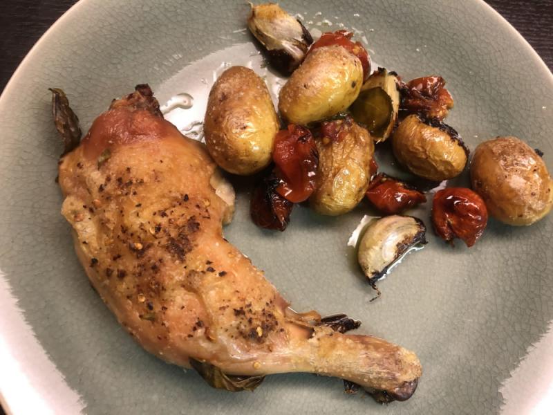 Vor ein paar Tagen hatten wir Hühnchenkeulen mit kleinen Tomaten und Kartoffeln sowie viel Knoblauch aus dem Ofen - das ist auch ein Rezept von Jamie Oliver. Du findest es in 'Essen ist fertig', aber auch in 'Natürlich Jamie'.