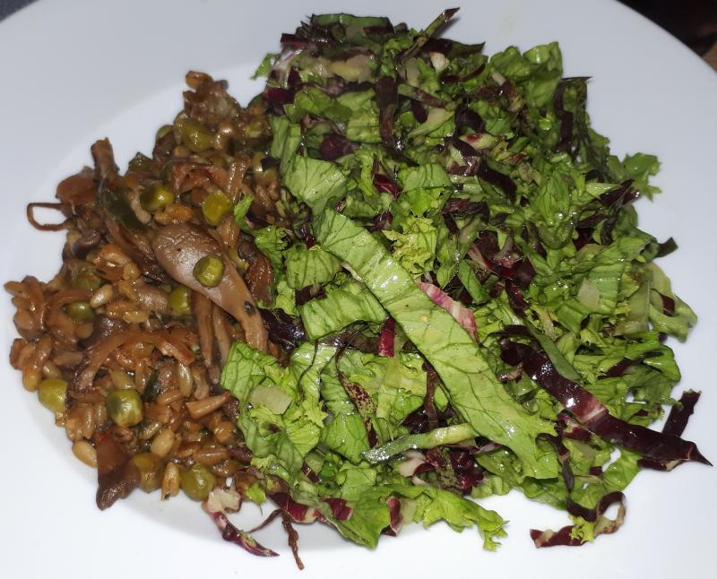 Grünkernpfanne mit Austernpilze, Erbsen und Parmesan, Reste von Gartensalaten