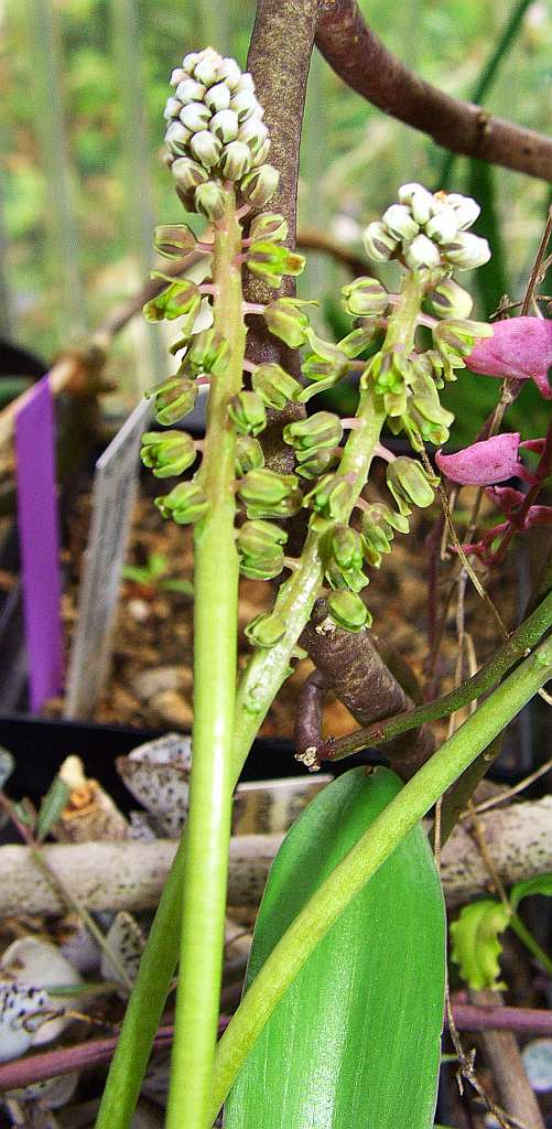 Eine hübsche Zwiebelpflanze ist Rhodocodon urgineoides. Die Gattung gehört zur Familie der Hyacinthaceae und wird als auf Madagaskar endemisch angesehen. Die Art selbst erinnert im Aussehen an ein Allium ursinum, der Blütenstand ist aber lockerer aufgebaut. Sie wächst in ihrer Heimat epiphytisch (was für ein Zwiebelgewächs eher seltsam anmutet), und zwar in Humusnestern im unteren Bereich der Bäume - vermutlich, um dem Fall-Laub zu entgehen.