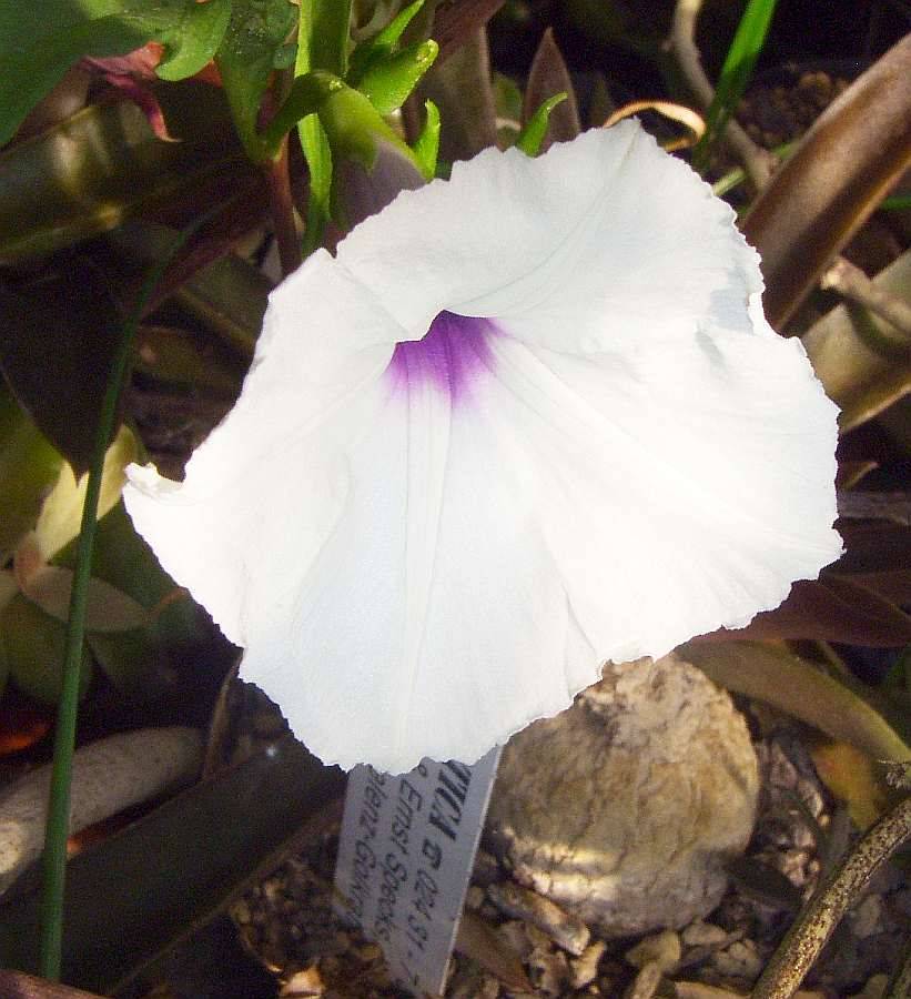 Dafür ist dieses Pflänzchen umso schöner: eine Schlingerin, die mit den gattungsüblichen schönen Blüten aufwartet, aber tatsächlich im Topf ein fettes knolliges Speicherorgan (man sieht's unter der Blüte), einen sogenannten Caudex aufweist: Ipomoea lapathifolia.