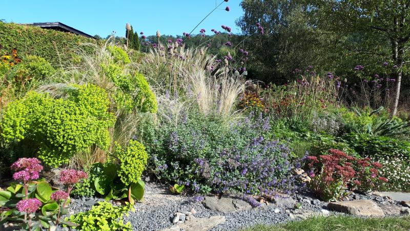 Der tieferliegende Rand (auf dem Foto rechts und rechts hinten) ist nur dünn mit Sand bedeckt und etwas feuchter. Dort habe ich bereits vorhandene Helleborus stehen lassen, die sind erstaunlich gut durch die Dürre gekommen. Auch die bereits vorhandenen Astern "Nachtauge" und A. cordifolius im Hintergrund waren bereits dort und stehen ein bisschen im Schatten des dahinterliegenden Apfelbaums.