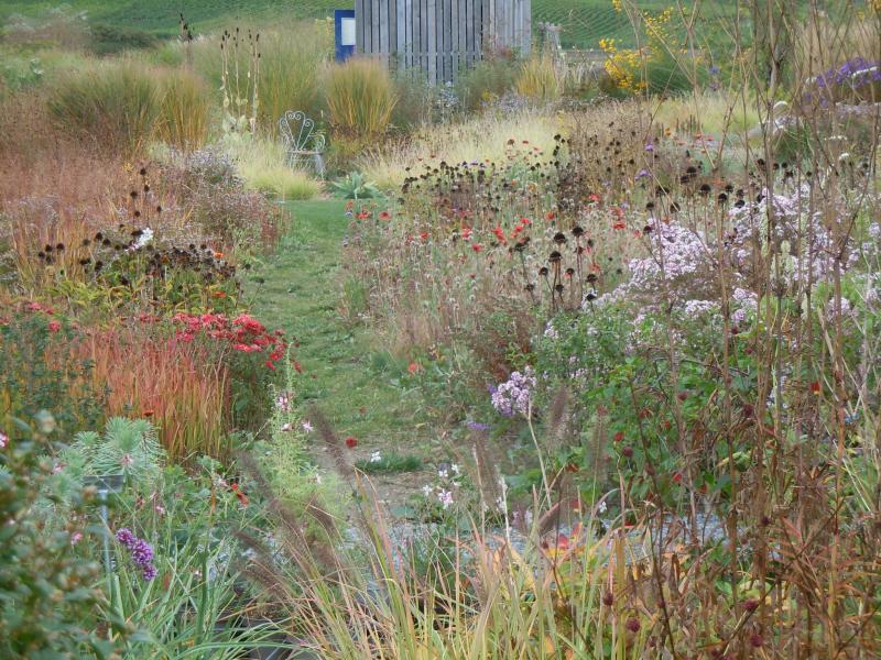 Dort sind auch (sparsam verwendet) frisch gepflanzte Gehölze drinnen, Asimina triloba und Salix exigua z.B. Dazwischen überall Wege, sind ja Schaubeete. Ich habe jetzt speziell die Beete gezeigt, wo die Stauden direkt in Sand gesetzt sind.