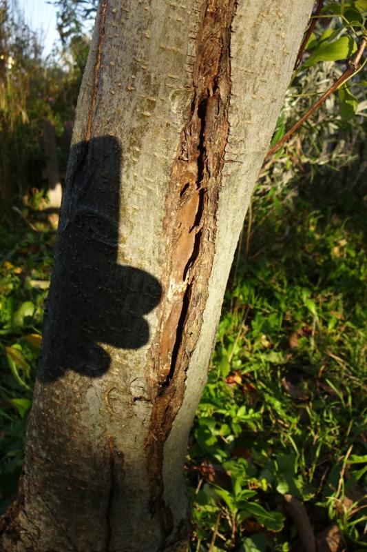 Letztes Jahr (oder vorletztes?) bekam der Stamm einen Riss. Erst dachte ich an einen Frostriss, war dann aber sicher, dass er im Sommer erst entstanden war.