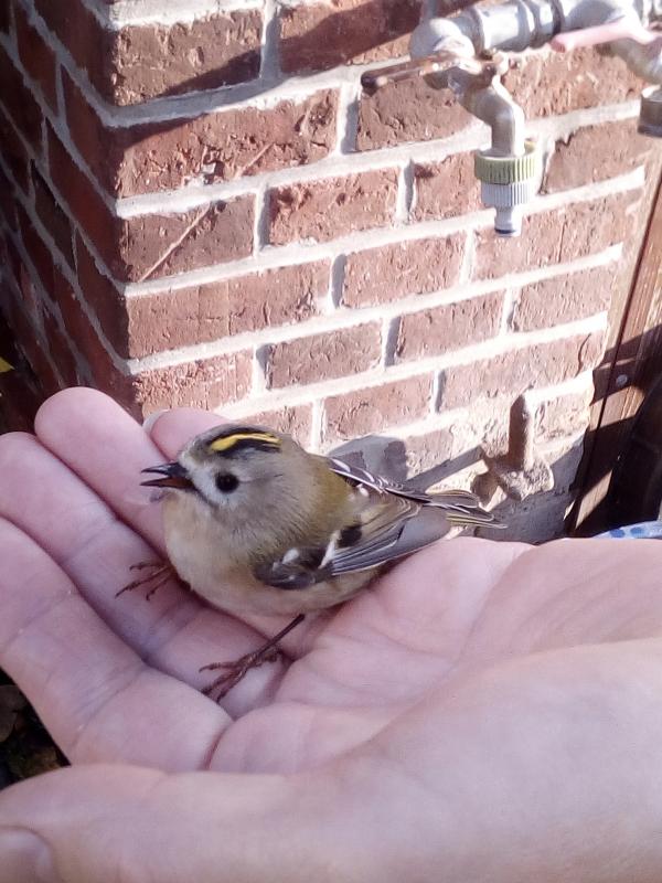 Goldhähnchen fliegen auch gegen recht kleine Scheiben - selbst wenn Greifvogelatrappen drauf kleben.