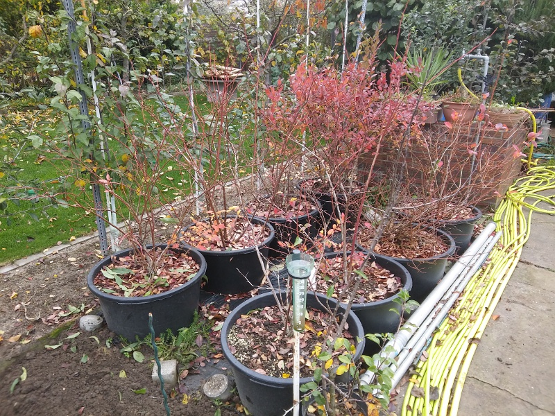 Hab mir jetzt noch 3 verschiedene Sträucher (Goldtraube, Bluecrop und Duke) geholt und in Kübel gepflanzt, so kann ich diese im Sommer mit in den Folientunnel stellen.
