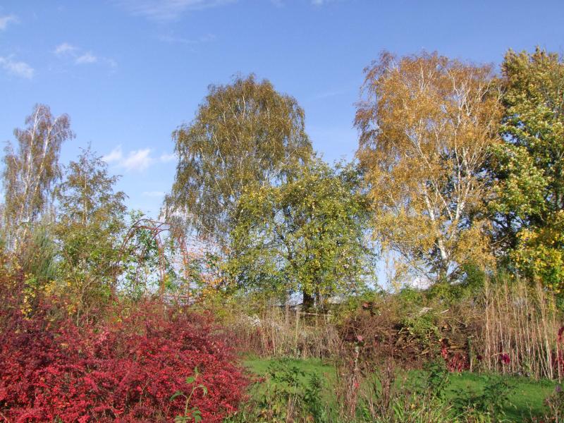 Östliche Grundstücksgrenze mit Birken und einem Wildapfel in der Mitte.Die Vögel freuen sich und lärmen lautstark darin herum.