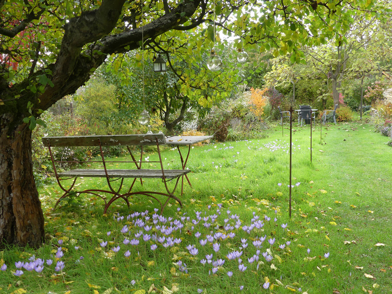 Die Herbstkrokusse dürften jetzt auf dem Höhepunkt ihrer Blüte angekommen sein. Die Kirsche wirft schon reichlich Laub.