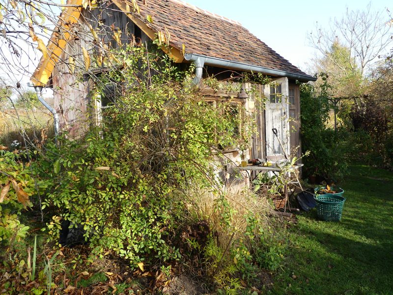 Ohne die Rose hat sich die Ansicht nun sehr verändert. Ans Häuschen kommt statt der 'Witzenhausen' ein weniger stark wüchsiger Rambler. An der vorderen Ecke werde ich nun versuchen, eine Franklinia zum Wachsen zu überreden. Wenn es gelingt, stelle ich mir ein aufgeastetes Exemplar vor.