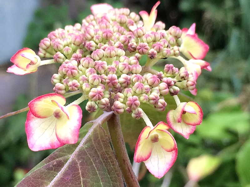 Hydrangea sargentiana hat im Herbst noch eine schöne Wirkung, wenn auch die ersten Blätter bereits gefallen sind.