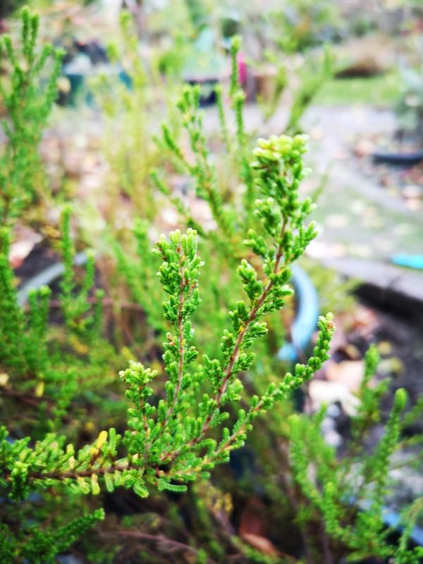Was habe ich hier eigentlich im Kübel? ??? Eine Hebe? Baumheide ist es ja nicht. oder? Alle im Beet eingepflanzten sind inzwischen verschieden, nur die im nichtbeachteten Topf wächst.