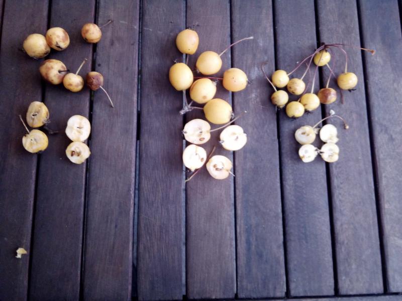 Der andere hingegen war etwas größer und nicht so ungenießbar wie die Muttersorte. Der Geschmack ist immernoch zusammenziehend, und das Fruchtfleisch trocken sowie hart, aber dieses mal mit deutlichem Aroma und guter Säure, sehr interessant. Mal sehen wie er sich die Jahre noch zeigen wird, sind ja grade die erstlingsfrüchte. Vielleicht ziehe ich von dem ein paar Sämlinge, die Väter der Kerne sind Tafelsorten. Es wäre cool wenn sich das intensive Aroma erhalten und die anderen Qualitäten verbessern würden. Gelbfleischige leckere Zieräpfel wären doch was.