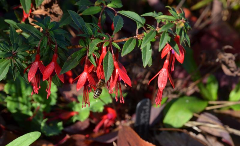 Die winterharten Fuchsien haben die Temperaturen knapp über Null zum Glück gut überstanden, und es gibt sogar noch Besucher!