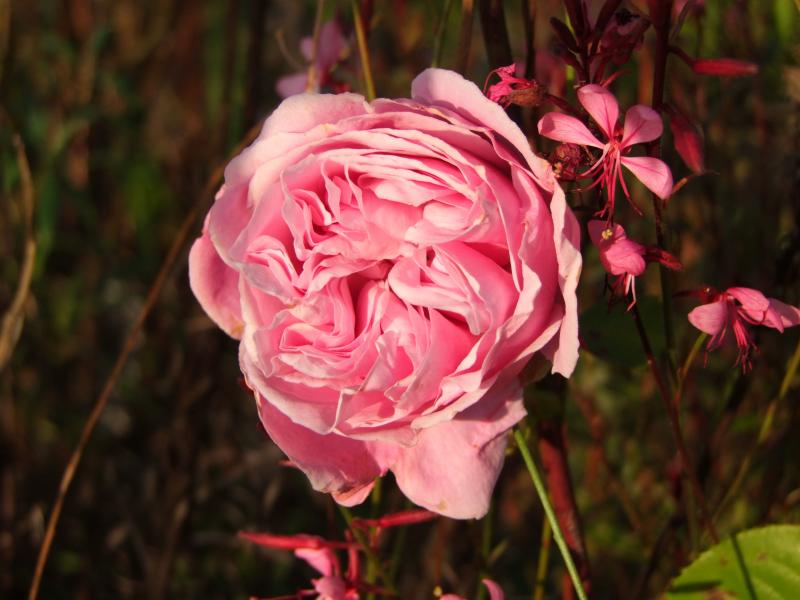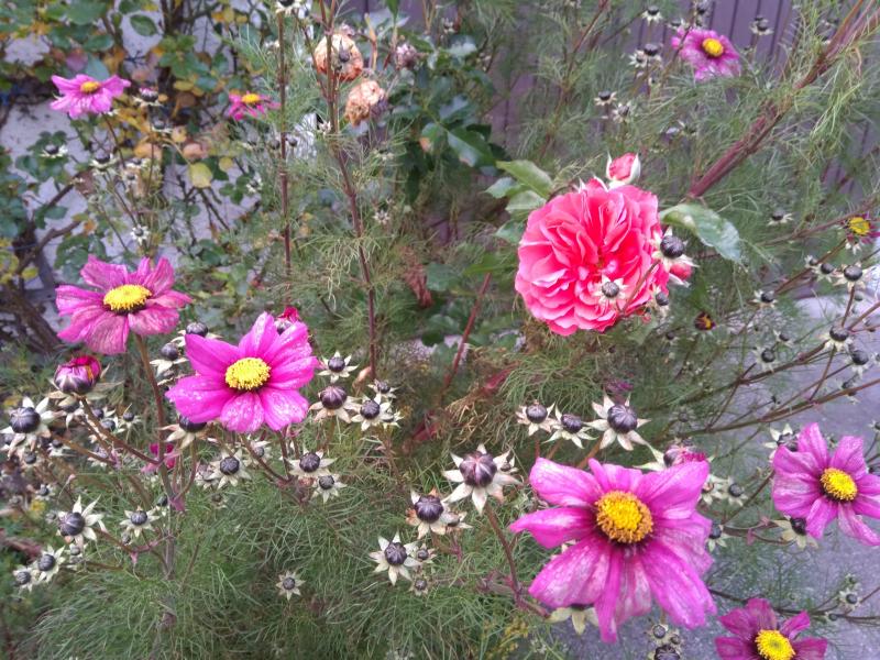 Meine letzte Rosenblüte in dieser Saison: Rosarium Uetersen zwischen den letzten Cosmeen, die gestern wohl etwas in der Kälte gelitten haben ::)