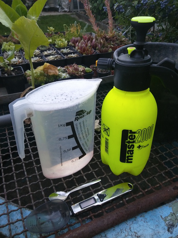 Ich benutze für kleine Mengen die 2 Liter Spritze von Marolex. Vorteil ist die Düsen lassen sich austauschen, man kann die Hohlkegeldüse gegen eine Flachstrahldüse mit der gewünschten Durchlassmenge austauschen.