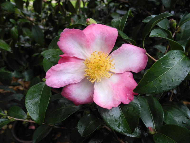 Seit ein paar Tagen beginnen die Sasanquas hier auch, ihre Knospen zu öffnen.