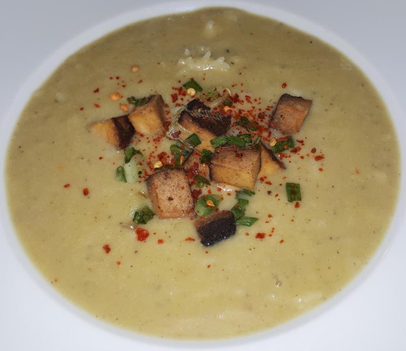 Gestern gab es Brokkolisuppe mit Reis und Räuchertofu