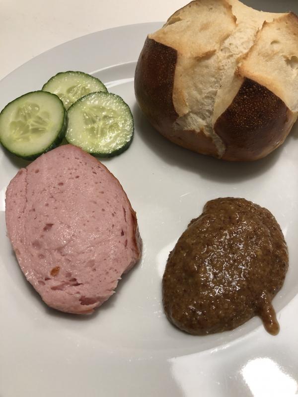 Als schnelles Freitagsessen gab es heute Fleischkäse aus dem Ofen mit süßen Senf und Laugenbrötchen.