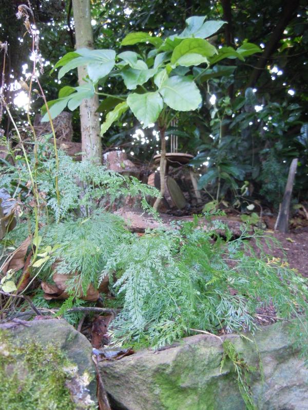 Daneben ist ein Farn wieder aufgetaucht. Gelbe Flecken/Mittelrippe im Wedelinneren. Ach, wie heißt der bloß ???