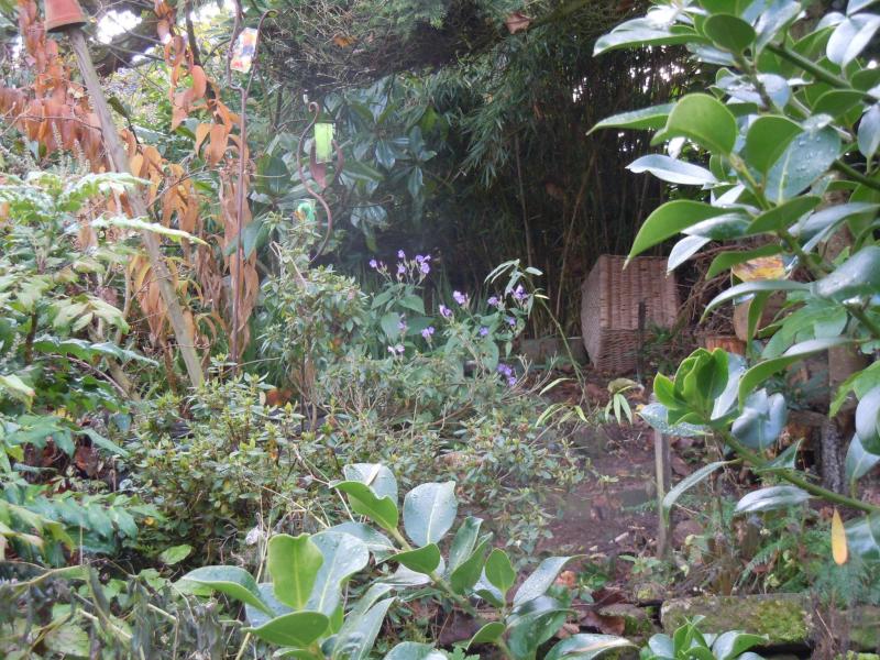 Strobilanthes rankanensis (?) blüht noch in leuchtendem blauviolett. Mehr blau als violett, leider kommt das auf dem Foto im Schatten nicht rüber. Hier kommt absolut nie Sonne hin. Auch die leichten Fröste scheinen der Pflanze nichts ausgemacht zu haben. Vieles im Hang ist bereits zu Matsch geworden.