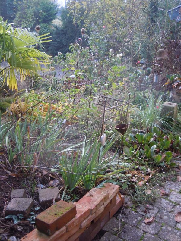 Mitte November ist die aride Zone erst mal vorbei. Unter Gehölzen und etwas tiefer ist die Erde zwar immer noch trocken, aber die Sonne kommt jetzt nicht mehr so in meinen Garten und der ständige Tau und Nebel hinterlässt einen feuchten Eindruck, alles tropft. Heute früh gegen halb 10 kam aber noch diffus Sonne hin.