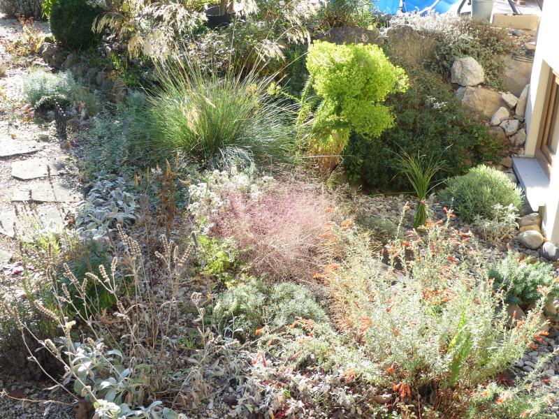 Mitte November ist die aride Zone erst mal vorbei. Unter Gehölzen und etwas tiefer ist die Erde zwar immer noch trocken, aber die Sonne kommt jetzt nicht mehr so in meinen Garten und der ständige Tau und Nebel hinterlässt einen feuchten Eindruck, alles tropft. Heute früh gegen halb 10 kam aber noch diffus Sonne hin.