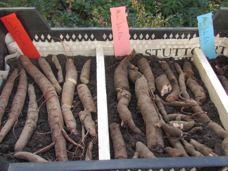 Um die Rüben dann wieder in den Boden zu bringen, kann man eine flache Grube graben, die Wurzeln reinlegen, mit lockerer Erde zudecken und abwarten. Manche schwören darauf die Wurzeln polar und nicht irgendwie zu beerdigen, dazu ersetze man die Grube durch einen kleinen Graben und stelle sie rein.