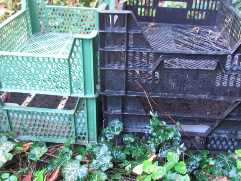 Für dieses Mal habe ich als "Beet" Plastikkisten genommen, weil das am allereinfachsten war. Als Substrat unten eine Schicht Sackerde, also böses TKS. Auch das weil einfach und sie eh nicht überlange drin bleiben sollen. Kompost ginge freilich auch. Als ich mal der unausgegorenen und schon längst ad acta gelegten Idee, nebenher und nach Feierabend "was mit Pfingstrosen aufzuziehen", verfallen war und hier Dutzende dieser Kisten rumstanden hatte ich alle möglichen geerbte Säcke mit Blumenerde verwendet. Ging alles.