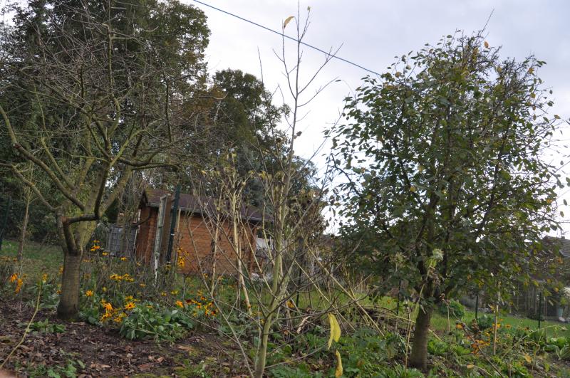 Herbst 2015, Blumeriella bei Achat sorgt für frühes Abfallen der Blätter vs. Jade, auch der Wuchs ist etwas zu sehen. Achat trägt nur auf 2 jährigen Buketttrieben.