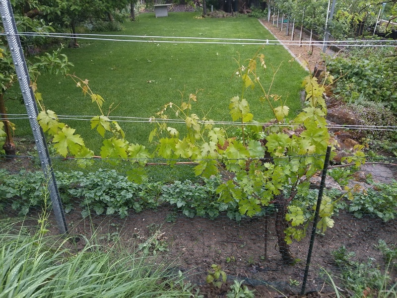 Hier stehen auch 2 Reihen Weinreben im Garten, hat schon der Vorbesitzer angelegt. Da reichen 2 Reihen Draht.