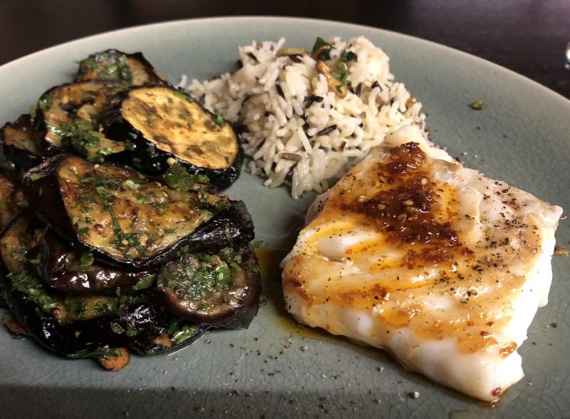 Gestern gab es Kabeljau, Aubergine mit Dill, Koriander, Minze und Knoblauch aus dem Ofen dazu Reis und von dem "betäubenden Öl". :)