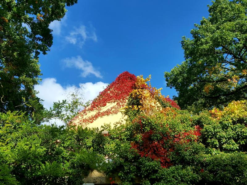 Von hier ein Blick auf den herbstlich eingerahmten Südgiebel unseres Nachbarhauses.