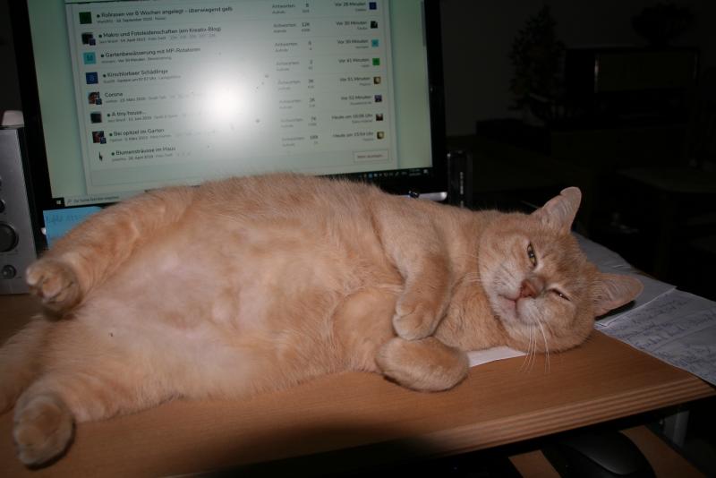 Ihr erzählt wieder so schöne Geschichten über Euere Gartentiger. :D Habe so lachen müssen. Mit meinem Rudi gehts mir auch so gut. Muß oft so lachen mit ihm. Er ist sehr anhänglich und liebesbedürftig. Er hat, glaube ich, viele Verlustängste erlitten. Wenn ich in die Arbeit gehe, so einmal die Woche ein Vormittag, sage ich ihm immer" ich muß jetzt weg,bleib schön brav und paß auf alles schön auf" streichle ihm über den Kopf und gehe dann. Er merkt es ja schon im Vorfeld, stelle meine Tasche schon griffbereit zur Haustüre. Er bleibt dann schon oben auf der Treppe sitzen und schaut mir nach. Wenn ich dann wieder komme freut er sich ungemein und begrüßt mich ganz liebevoll. Seit neuesten lege ich mich immer mal im Büro auf das Gästeett und mache ein Schläfchen. Dann schaut er mir schon so interessiert zu. Breite die Decke aus, schon liegt er oben auf dem Kissen quer rüber, so quasi "das ist aber mein Kissen". Lege mich aber hin und drücke ihn so ein bißchen auf die Seite. Habe dann nur einen kleinen Platz auf dem Kissen :D :D, aber er ist mir dann ganz nahe, legt sich dann so mit dem Kopf und den Pfoten über die Schulter und läßt sich genüsslich streicheln und schnurrt ganz laut. Er liegt ja auch so gerne auf dem Schreibtisch am PC, die Tastatur ist so auf einem Schub so unter dem Tisch, am liebsten so ganz nah am Gesicht. Er liebt es so, wenn ich ihm ganz nah ans Gesicht komme und mit ihm flüstere, was er für ein lieber ist. Dann wirft er sich hin und hält mir seinen dicken Bauch hin zum streicheln. Er ist fit und gesund und es geht ihm scheinbar auch seelisch viel besser, als wie ich ihn bekommen habe. Darüber freue ich mich sehr. Wir verstehen uns schon viel besser, kann schon viel besser seine Gedanken lesen, wenn er mich mit großen Augen anschaut, wenn er mir was sagen will.