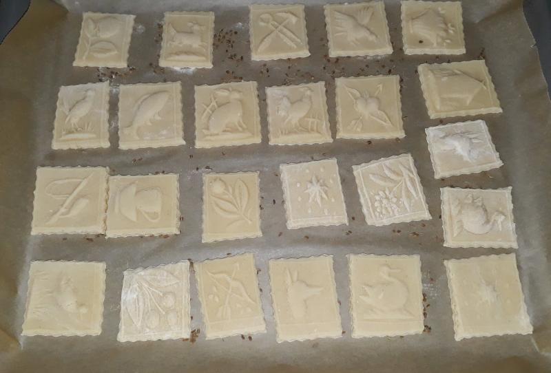 Gestern kam wieder meine (ur)alte Modelrolle zum Einsatz. Noch trocknen die Springerle, aber wenn gleich der Stollen fertig gebacken ist, kommen sie in den Ofen.