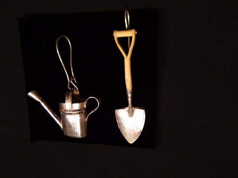 Schaufel und Gießkanne aus Silber, der Schaufelstiel aus Eibenzweig gefertigt.