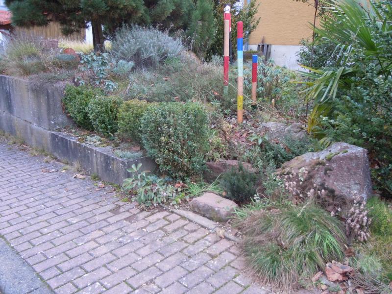 Seine Garageneinfahrt steigt leicht an, da hinten geht es fast einen Meter in unser Beet runter.