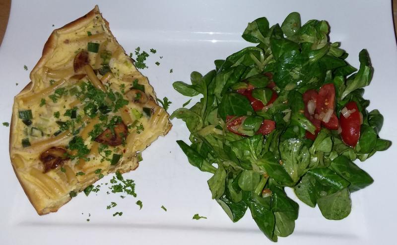 Heute gab es ein Nudelomelette mit Champignons und Gartenporree, Feldsalat mit Tomaten