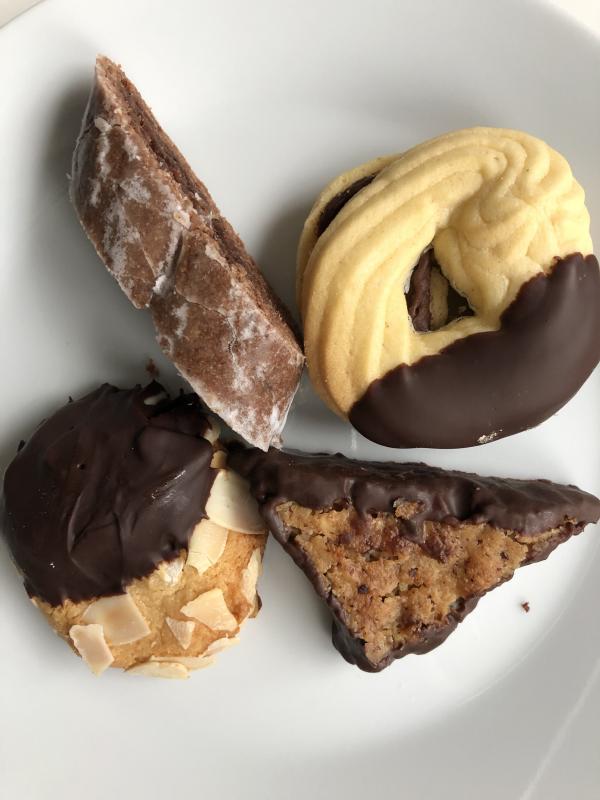 Ich bekam dann als Gegengabe ein Stück der Torte, ok und lecker, mir aber eigentlich zu mächtig. Dazu ein Tütchen Plätzchen von der Tochter gebacken. Um diese Plätzchen geht es gerade, falls es Rückfragen gibt, werde ich vorsichtig anmerken, dass sie lieber weniger Vanillinzucker verwenden sollte und überhaupt besser echten Vanillezucker. Auch anderes Plätzchen aus der Tüte war übervanilliert.
