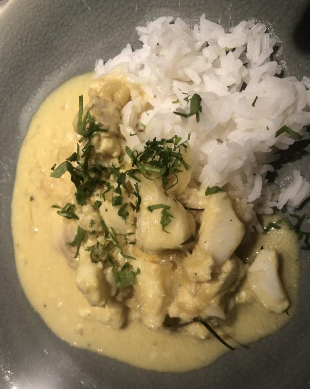Die Lammkeule, die wir gestern aus der Tiefkühltruhe in den Kühlschrank verfrachtet haben, war noch nicht zu verarbeiten. Deshalb gab es ein Fischcurry (da waren auch noch Fischreste im TK) mit Kokosmilich, Kafirlimettenblättern, Knoblauch, Zwiebel, Ingwer, Chili, Kurkuma, Curry, Kreuzkümmel, Fischsauce und dazu Reis.