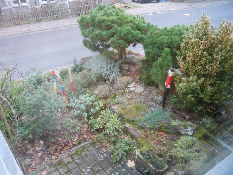 Hier mal der Blick aus dem Esszimmerfenster auf den Vorgarten. Meine kleine Macchia, bzw. Garrique. Diese Woche war es grau und neblig. Und kalt.