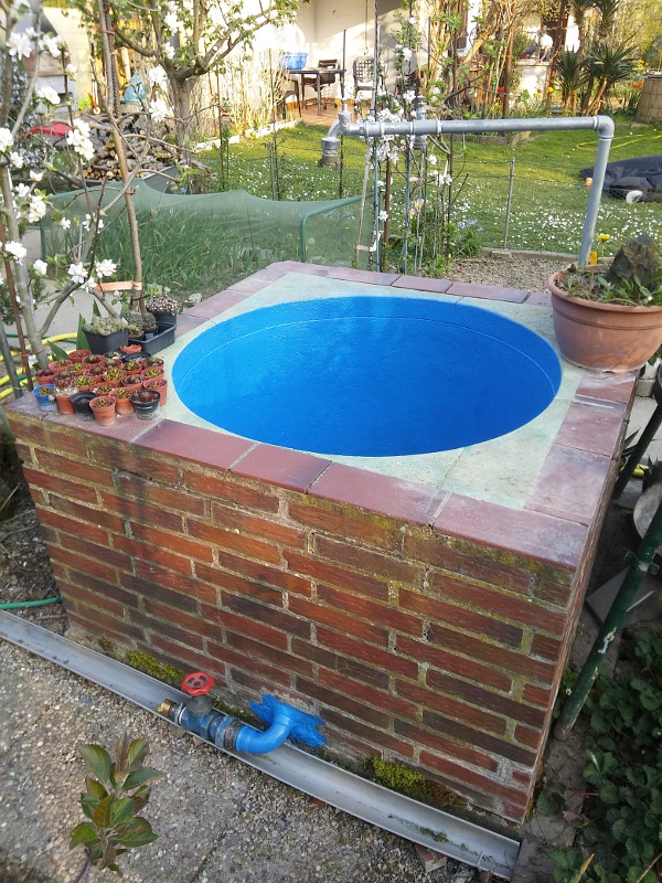 In solchen Becken sind unsere Wasserhähne in der Gartenanlage verbaut. Ich habe im Frühjahr mal das Abflussloch neu gemacht das ich abschiebern kann, blau gestrichen damit es wieder etwas dichter ist und ich das Teil im Sommer auch mal als Pool benutzen kann.