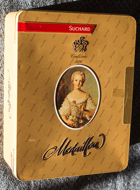 Eine der Dosen, gerade in Gebrauch, vermutlich ein Geschenk mit Inhalt und vermutlich Jahrzehnte alt.