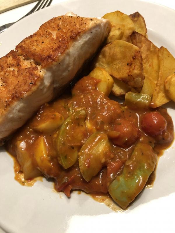 Ich hab gestern Gartenvorräte abgebaut. Zucchini hellgrün und gelb und Cocktailtomaten in Tomatensoße. Dazu ein Stück Fisch und Ofenkartoffelscheiben.